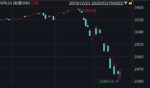 美股熔斷基準(zhǔn)指數(shù)標(biāo)普500日K線走勢圖。