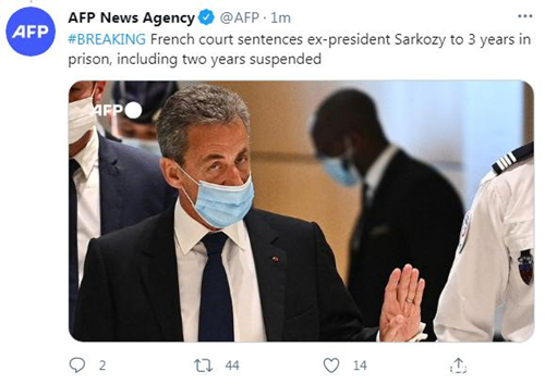 當?shù)貢r間1日,法國巴黎輕罪法庭就前總統(tǒng)薩科齊涉嫌貪腐和以權謀私案作出裁決,判處其三年有期徒刑,其中兩年緩期執(zhí)行。薩科齊成為繼希拉克之后第二位被判有罪的法國前總統(tǒng),也成為首位將入獄服刑的前總統(tǒng)。