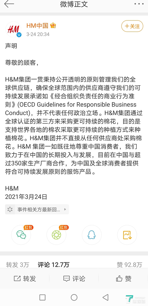 在多方紛紛對(duì)H&M的聲明做出品牌抵制回應(yīng)后,昨晚,H&M集團(tuán)又發(fā)布了一份語(yǔ)焉不詳?shù)幕貜?fù)聲明: