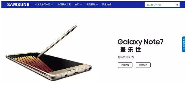 目前,在中國的三星官網(wǎng)上,Note7還仍作為主推商品,在首頁最醒目的地方。