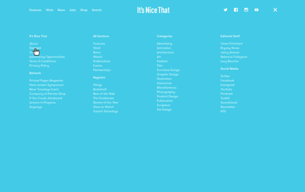 這種導航往往用的是 JS 語言排列布局,加上很多動效。這種方式往往會在一定程度上破壞可用性,但不得不說這會給人非常新穎的感覺。